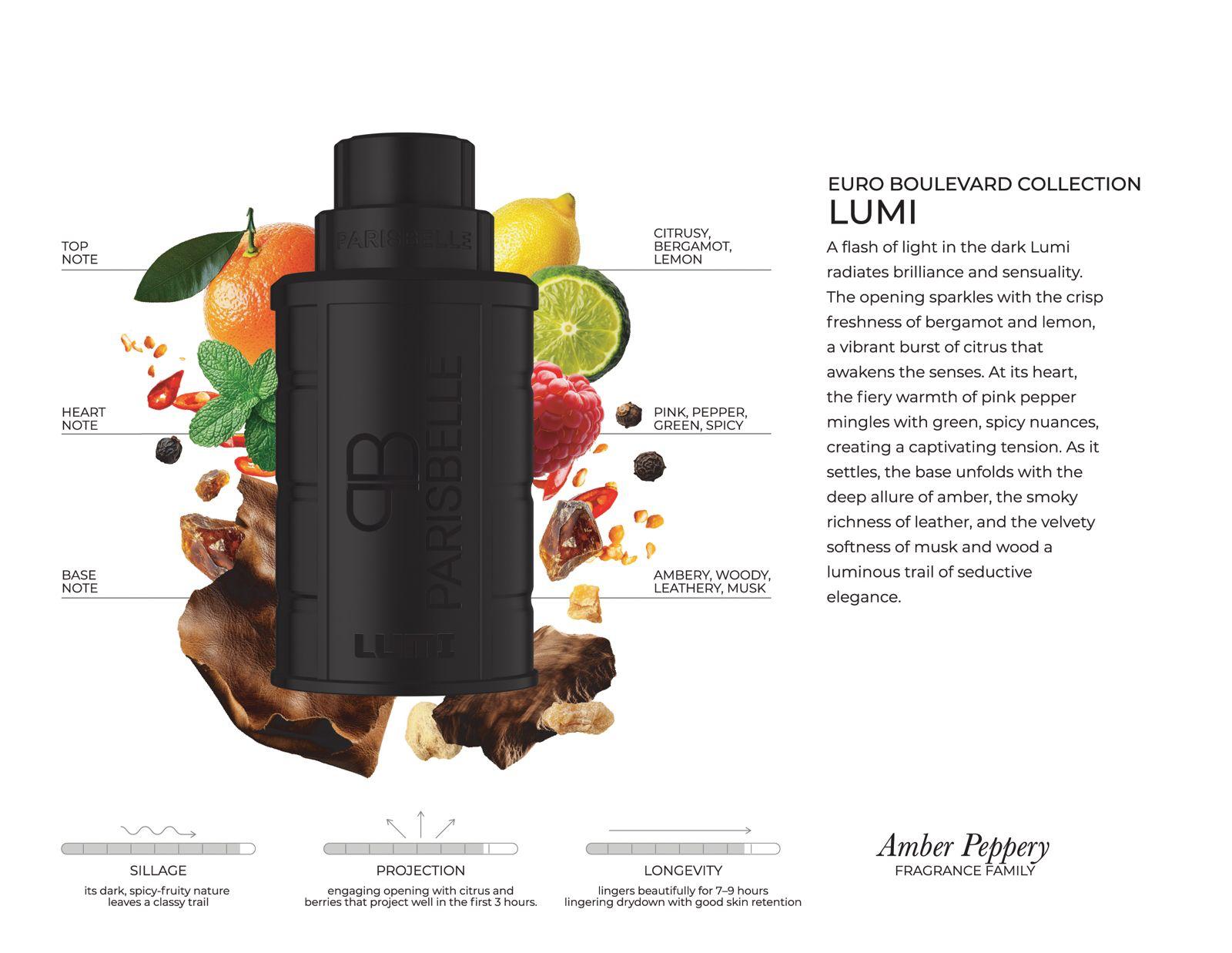 A crisp blend of citrus, pepper, and amber — LUMI is ParisBelle’s spark of elegance in the dark.